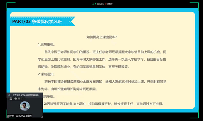 多年来,公司一直在探索基于成人员工的特点开展思想政治工作,各类评奖评优已经成为了重要的抓手。6月10日晚,公司举行了2020年度夜大、函授优良学风班线上答辩活动。经班级申请、公司初评推荐,来自校本部校内学习点、校本部沪西学习点、校本部沪北学习点、铁路局函授站的10个班级入围评选答辩环节。各班级代表认真准备,在答辩中展示了班级的特色,并逐一回复了评委的问题。