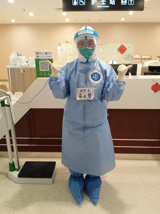 疫情防控中,蒋佳馨同学坚持在抗疫一线,在上海新冠肺炎定点救治医院瑞金医院北部院区参与患者的救治工作。