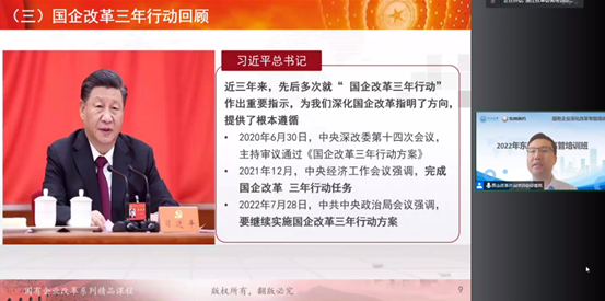 徐老师分两部分:《国企改革三年行动政策解读》和《国有企业经理层成员任期制和契约化管理操作要点解读》做了专题讲座。课程聚焦国有企业改革历程、国企改革三年行动的主要任务、国企改革三年行动收官及评估要求。