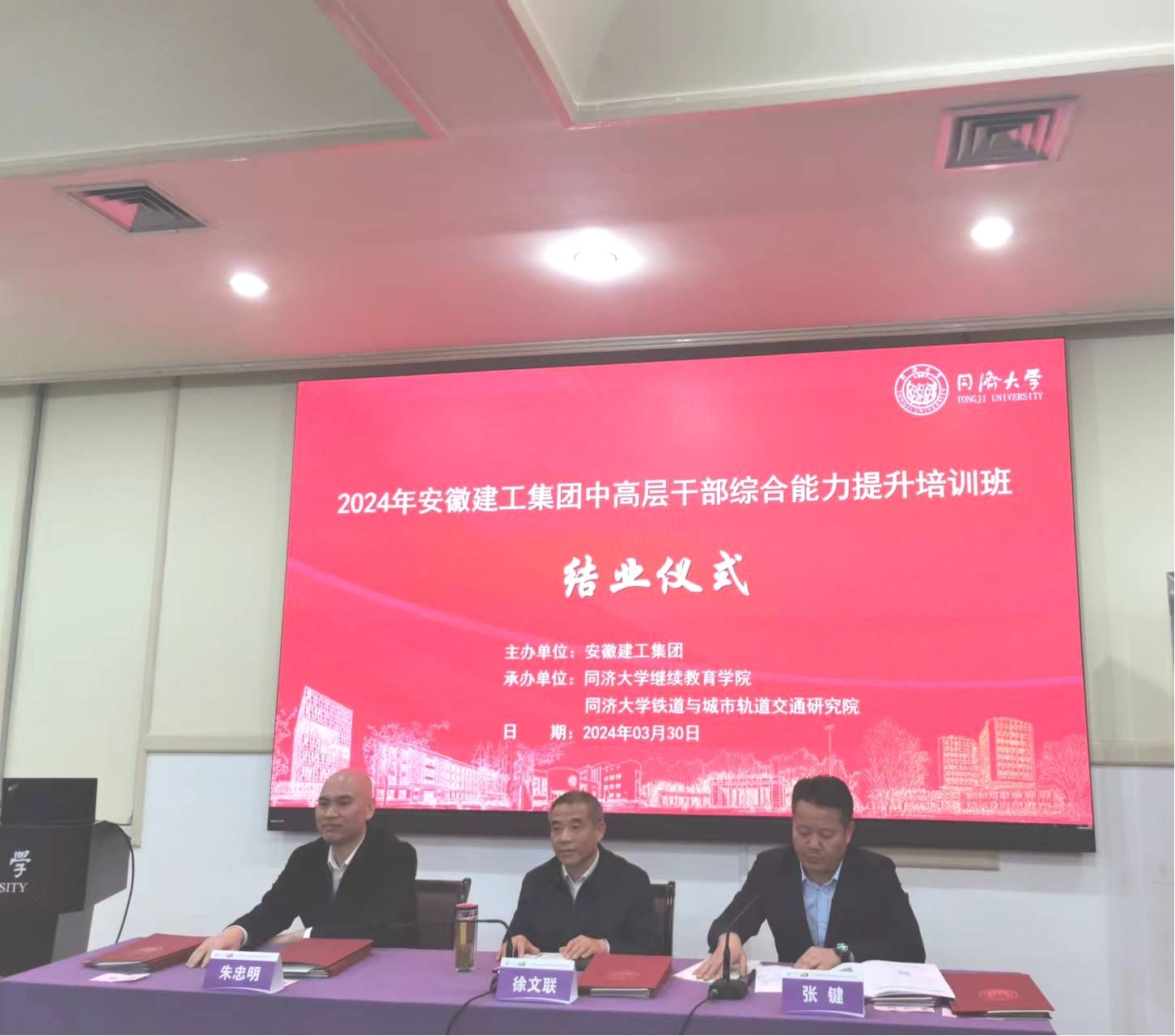 3月30日下午,课程结束后,建工股份副总经理、安徽水利党委书记、董事长张键,建工股份副总经理、建工二建党委书记、董事长朱忠明,安徽建工集团带队领导徐文联出席结业典礼,为学员代表颁发结业证书,并为本次培训作总结发言。学员代表钱叶琳、陈小群发表学习感言。